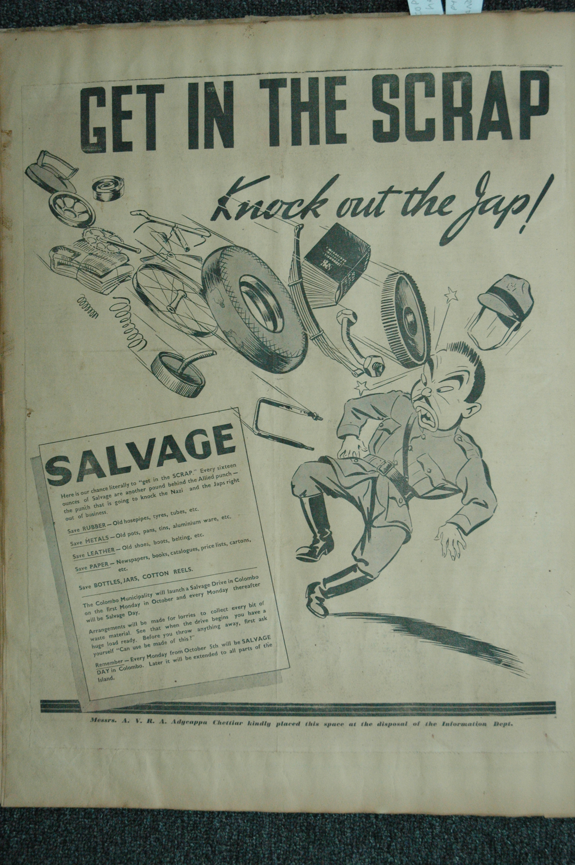 ‘Every sixteen ounces of salvage are another pound behind the Allied punch – the punch that is going to knock the Nazis and the Japs right out of business’. Government of Ceylon Department of Information poster, c. 1942.