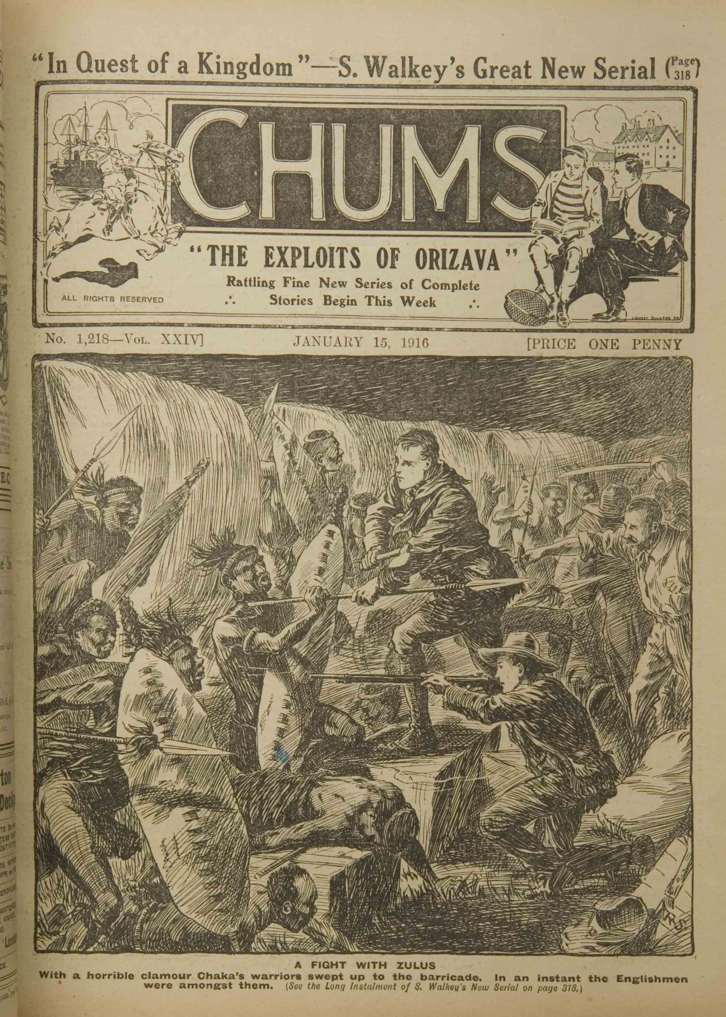 War and empire in British popular culture: “A Fight with the Zulus”. Englishmen – looking remarkably like the public school boys that the publication was aimed at – fight Zulu warriors. From “Chums”, 1916.