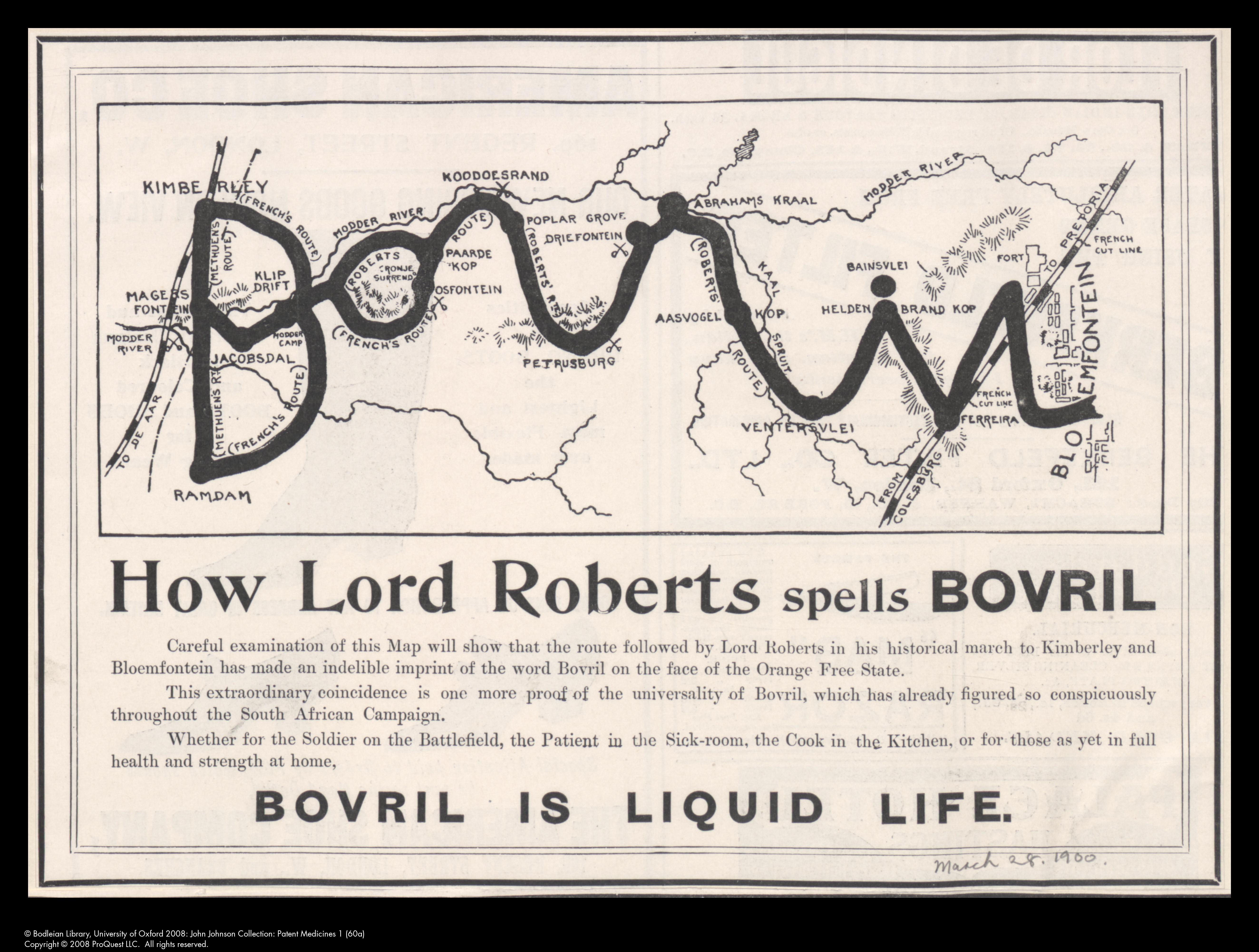 An advertisement for Bovril from 1900, showing how Field Marshal Lord Robert’s advance in South Africa during the Anglo-Boer War (allegedly) spelled out the product’s name.