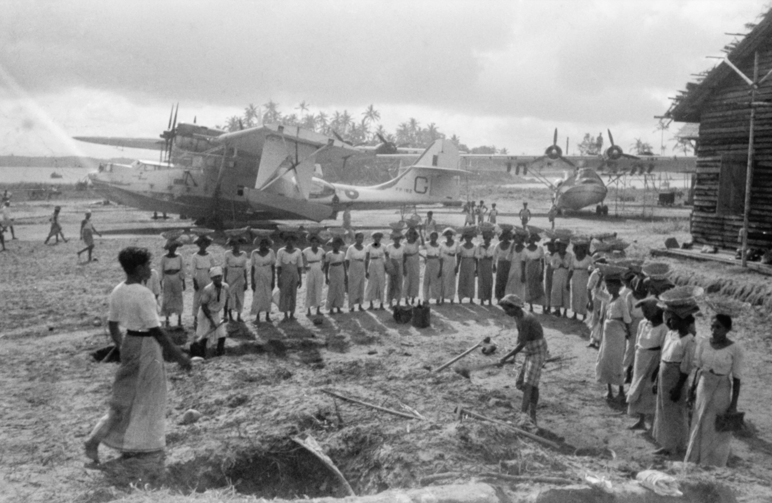 Sri Lankan women line up for head-basket loads of gravel, dug by male labourers, to repair the hard standing areas of the flying-boat station at Red Hills Lake, Ceylon, in November 1944. In the background can be seen Consolidated Catalina Mark IV flying-boats of 240 Squadron RAF.