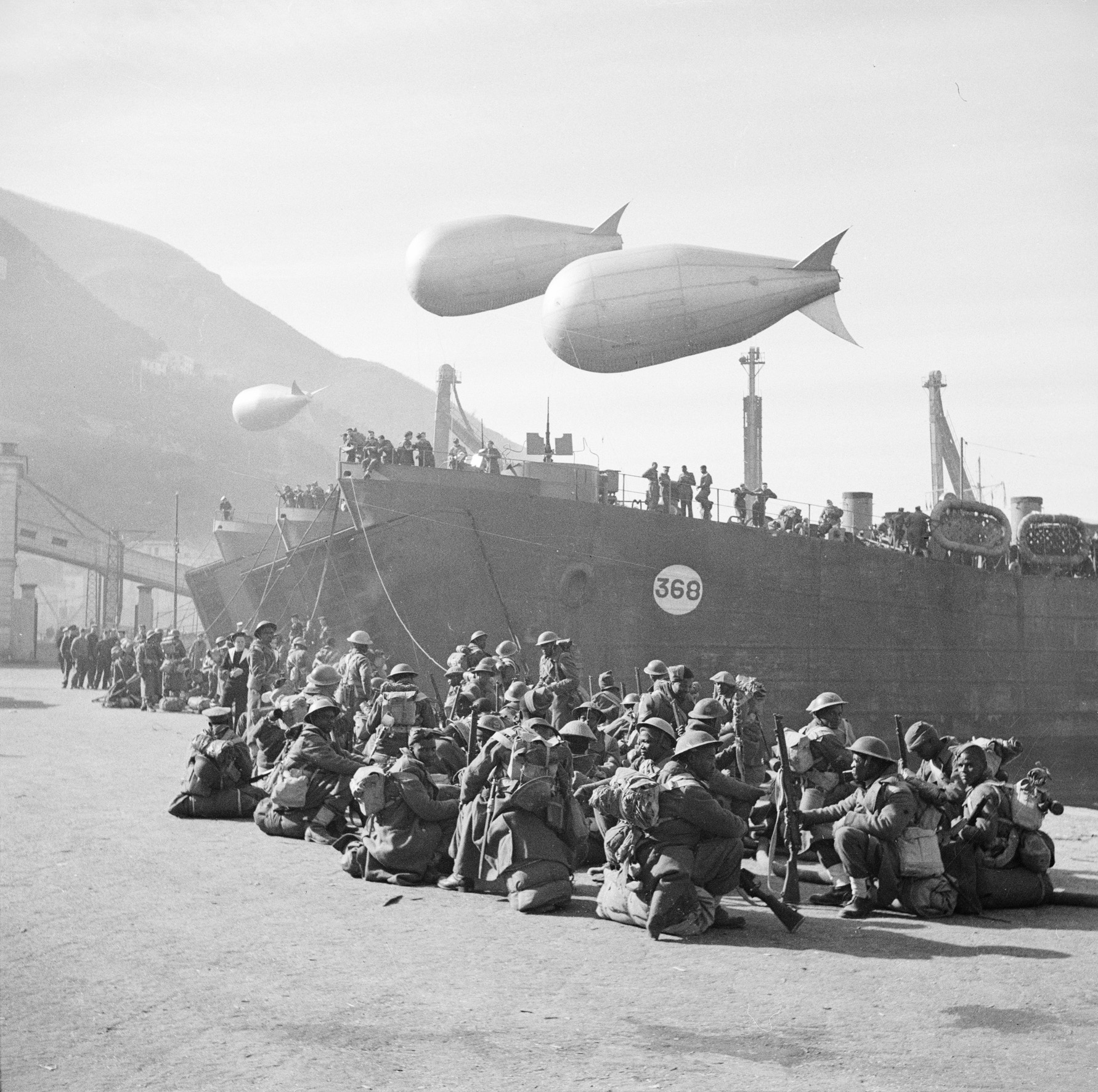 January 1944: Swazi troops of 1991 Swaziland Smoke Company wait at Castellammare for transit to Anzio, where they were to create smokescreens to shield the invasion area from the enemy.